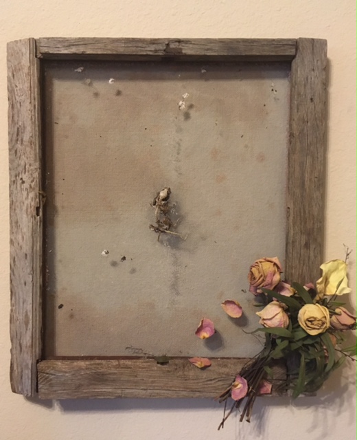 Medium: Old window screen from a shack near Roscoe, Tx, rodent skeleton, bouquet of dried flowers